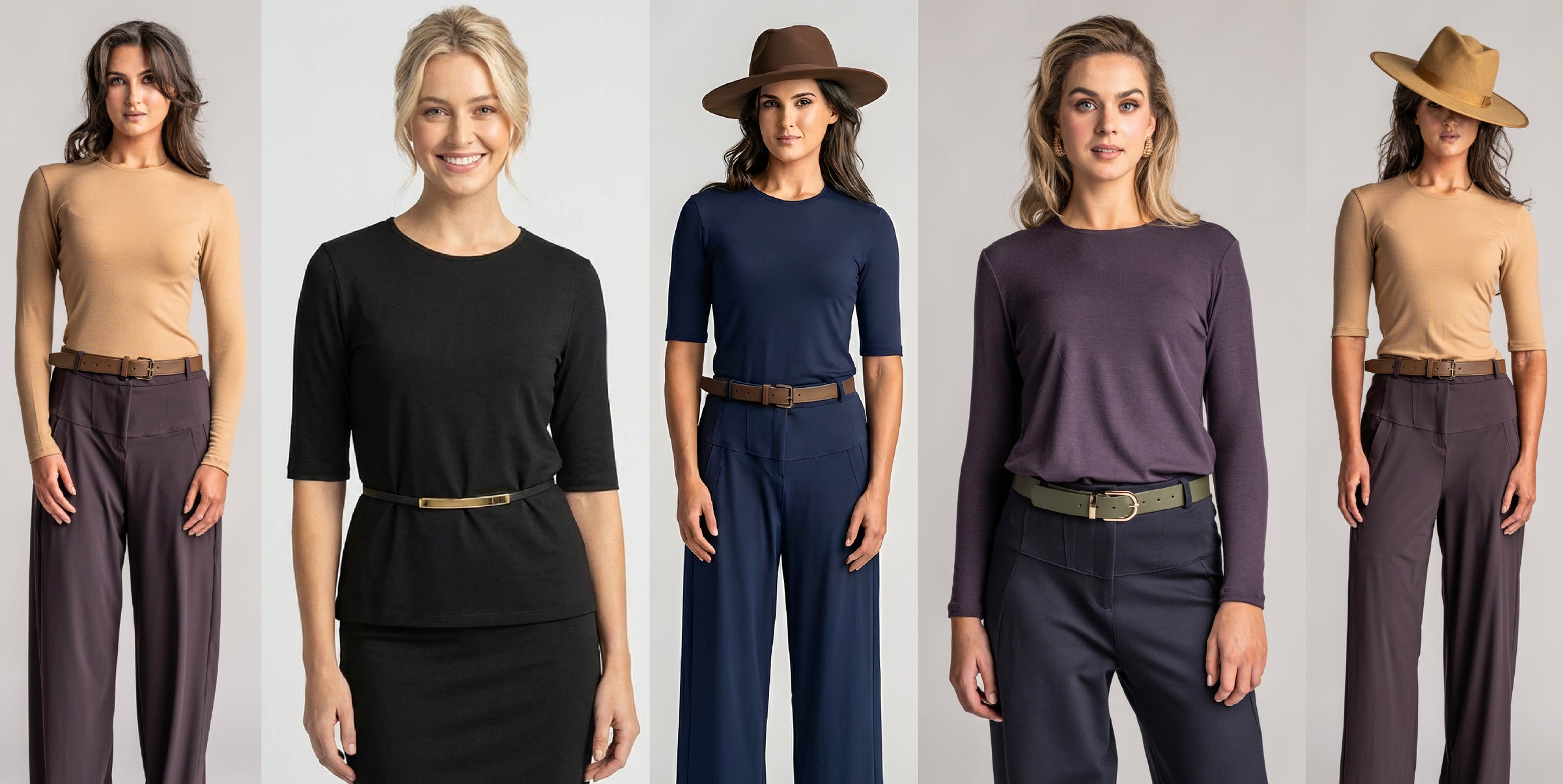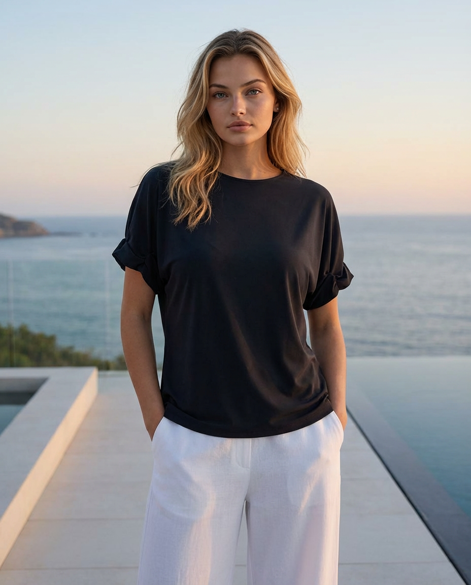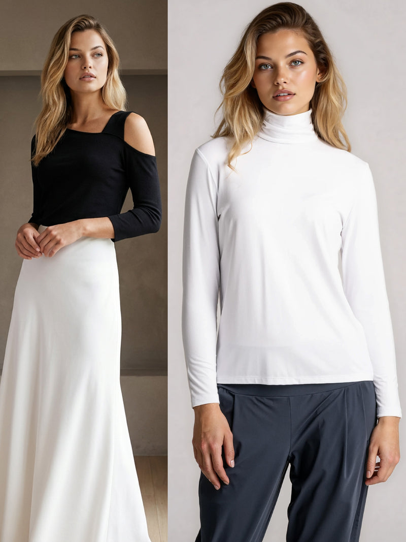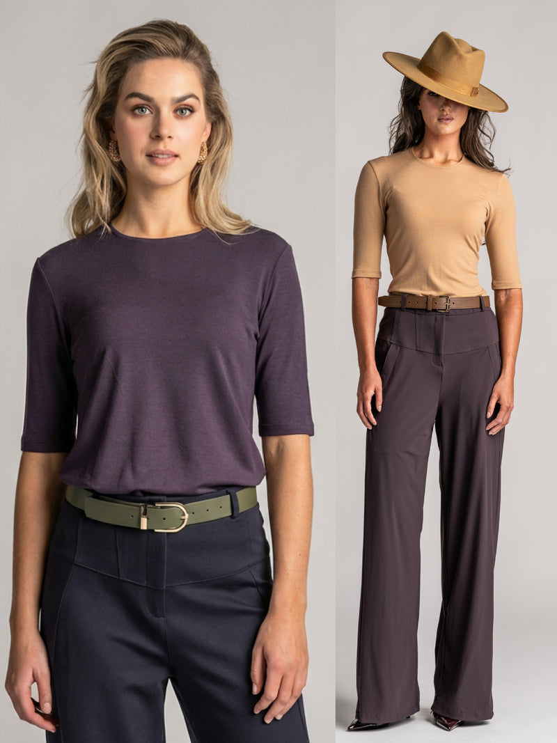 Three signature fabrics, each chosen for performance over time. Premium New Zealand merino, Italian Microjersey, and certified EcoVero. Every Paula Ryan piece starts with a fabric engineered to last a decade.